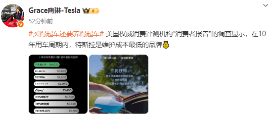 10月19日,特斯拉公司副总裁陶琳发文称:买得起车还要养得起车,美国威望消费评测组织“顾客陈述”的查询显现,在10年用车周期内,特斯拉是保护本钱最低的品牌。